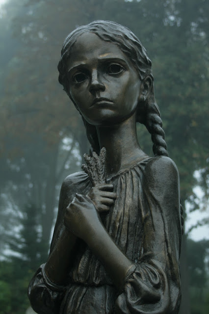 This statue represents the law of five. If anyone, small children included, stole anything, including food to stay alive, they were sent to Siberia or executed. Would you steal five potatoes to feed your child? This girl is shown holding five ears of wheat. People visiting here place small offerings at her feet.