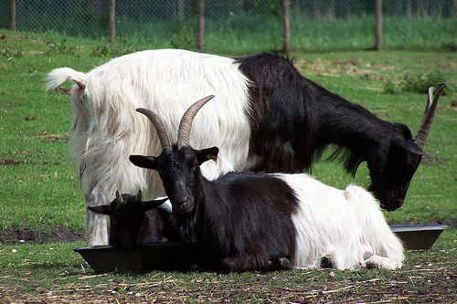 The ride so far was pretty interesting. The road ran around the edge of the lake and there were lots of interesting things that caught my eye. During the day we saw five Ferraris, four new Mustangs together, some hot rods, and a few old Chevs and Fords. We saw scuba divers, then half an hour later skiers and snow boarders. There was a Wiemaraner puppy, a couple of standard poodles, and goats that were half black and half white. The front was black and the back white, with a vertical line straight round the middle, like these guys...